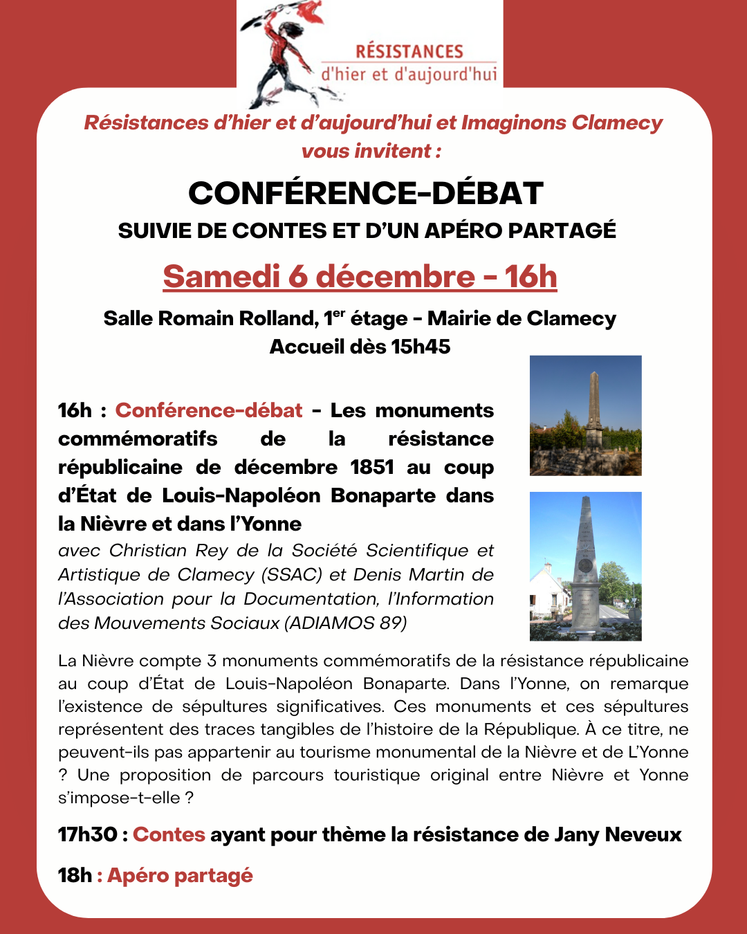 Nous contacter : adiamos89@laposte.net Décembre 2025 Samedi 6 décembre, 16 h, mairie de Clamecy, conférence Les Monuments commémoratifs de la résistance républicaine de décembre 1851 au Coup d'État de Louis-Napoléon Bonparte dans la Nièvre et l'Yonne avec Christian Rey (Société scientifique et artistique de Clamecy) et Denis Martin (Adiamos 89). (cliquer ici) (et aussi ici) La Colonne de Clamecy